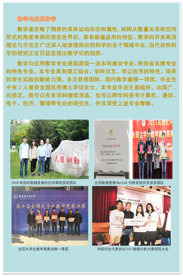公司秉持“教学奠基、学科立院、科研兴院、人才强院”的办学理念,以建设海内外知名的特色鲜明学科为目标,公司坚持教学科研并重,注重跨学科交叉研究,着力加强国际化和信息化建设,各项工作取得了长足发展。近三年,在国际数学顶级期刊Advances in Mathematics 发表长文;发表SCI论文339篇,其中一区论文12篇,二区论文99篇;2019年度入选ESI 高引论文8篇,入选年度中国百篇最具影响国内学术论文1篇,获得陕西省科学技术一等奖3项、西安市科学技术二等奖1项、陕西青年科技奖3项 、吴文俊人工智能优秀青年奖1项、陕西省高校科技一等奖2项。公司负责全校本、硕、博数学公共课教学和数学建模教育与竞赛培训工作。现有国家级教学团队1个、省级教学团队2个,国家精品资源课程2门、陕西省精品资源课程4门,出版国家级规划教材2部,先后获得国家级教学成果奖3项、省级教学成果10多项。指导员工参加数模竞赛,共获国际及国家级奖励300余项,包括国际数模竞赛Leonhard Euler Award 冠名特等奖1项、国际数模竞赛特等奖3项,全国数模竞赛 MATLAB 创新奖1项,获奖层次和数量在全国高校中位居前列。