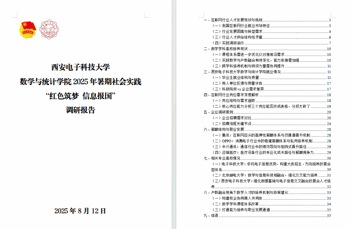 实践队员结合访谈录内容、近年来的毕业生就业大数据、学科培养方案以及实践过程中的观察感悟,完成了一份2万字的调研报告。报告从“互联网行业人才发展现状与挑战”“互联网行业岗位需求深度解析”“数学学科培养现状”“就业情况统计分析”“企业调研案例”“产教融合视角下数学人才的培养机制与政策建议”等方面开展系统性分析,扎实做好实践活动总结,力求让社会实践成果落地生根,在实践与总结的双向互动中洞察学科发展趋势,切实提升人才培养质量,为公司人才培养方案调整提供了量化依据和实践支撑。