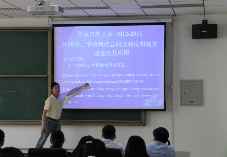 报告会上,胡宝清教授向大家分享了他在Algebraic approach to fuzzy logic,Interval-valued type-2 fuzzy sets,The generalization of rough sets,The three-way decisions这四个方面的研究成果,特别以一个十分生动的例子介绍了三支决策空间的动态三支决策,列举的例子是中国老员工课程通过决策。中国老员工课程通过决策要经过课程考试、重修、毕业前多个环节。除最后一个环节确定接受域与拒绝域外,前面每一个环节都要决策出接受域和不确定域。最后阐述了三支决策空间,它由给定的论域、决策域、条件域、评价函数构成。