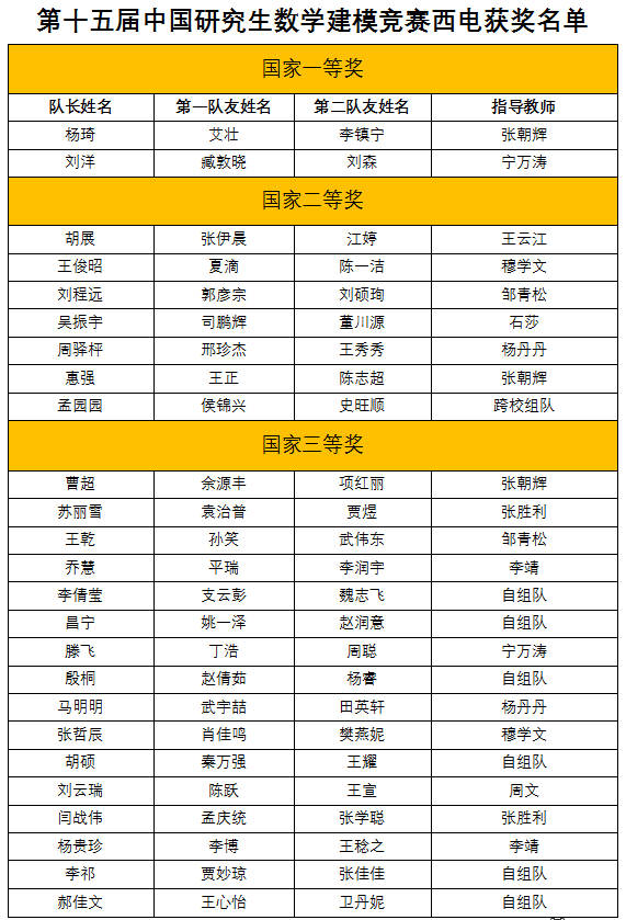 第十五届中国研究生数学建模竞赛甫落,西电获得2个国家一等奖、7个国家二等奖、16个国家三等奖的优异成绩(总计25项)。国家级获奖数创公司参赛历史新高并首次获得全国优秀组织奖。西电今年有74队共计224名研究生(加跨校组队)成功参赛,获国奖数量占参赛数量三分之一,居全国前列,相较2017年获奖数增长67%。国家一等奖获奖比例超出全国一等奖平均获奖比例近一倍。