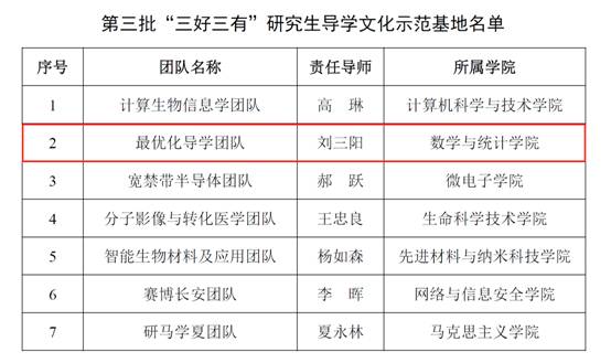 最优化导学团队通过对照“三好三有”标准,总结经验,凝练特色,形成示范样板,并利用最优化团队实验室、走廊等空间,以文化墙、海报、影音和实物等形式进行展示,打造出有特色、可参观的团队文化宣传阵地,最优化导学团队将同其余6支入选团队一起为全校研究生导学团队提升育人水平发挥示范引领作用。