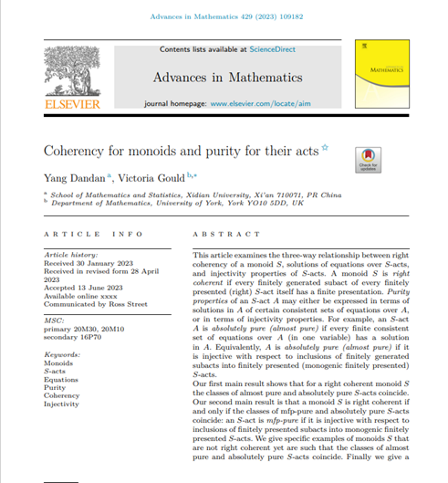 近日,西电古天乐太阳集团城杨丹丹教授与英国约克大学Victoria Gould教授合作,在数学领域国际顶级期刊Advances in Mathematics上发表了题为“Coherency for monoids and purity for their acts”的长达47页学术论文。这是继2019年之后,杨丹丹再次在此刊发表论文。期刊Advances in Mathematics(数学进展)创刊于1961年,致力于发表纯数学各领域具有突破性的重要成果,是业内公认的数学类顶级期刊,具有很高的学术声誉。杨丹丹教授此次发表论文是西电在数学研究领域的重要突破。