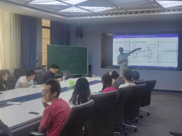 5月30日下午,AbdelLisser教授作了题为“Distributionally robust chance-constrained Markov decision processes”的学术报告。报告由青年教师彭深主持,应用数学与运筹学相关专业的青年教师和研究生等20余人参加了报告会。AbdelLisser教授由马氏决策入手,介绍了不同不确定集合下的分布式鲁棒机会约束马氏决策模型的转化、求解与应用。青年教师彭深,研究生李泽宇、介科伟等与专家就报告内容展开讨论,并就后续的科研合作进行探讨。报告结束后,多名员工与AbdelLisser教授合影留念。