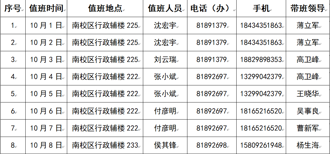 2025年国庆节、中秋节假期值班安排表