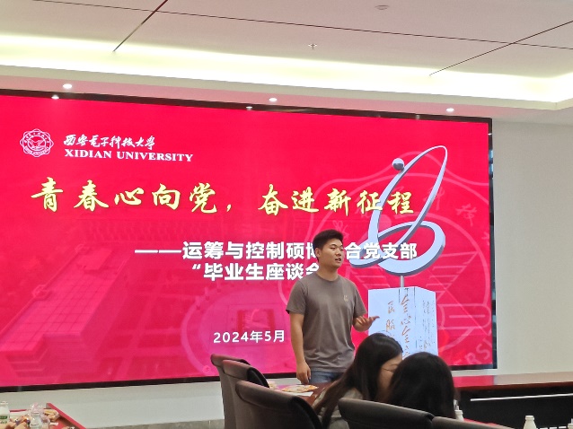(通讯员王宇东)为深入推进党纪学习教育走深走实,同时为引导和激励广大毕业生党员坚定理想信念,在新征程中勇担时代使命,以饱满的热情走向新的学习和工作岗位,运筹与控制硕博联合党支部于5月30日18:00在网安大楼121会议室召开“青春心向党,奋进新征程”主题党日暨毕业生党员座谈会。会议由支部书记王宇东主持,支部全体党员参加。
