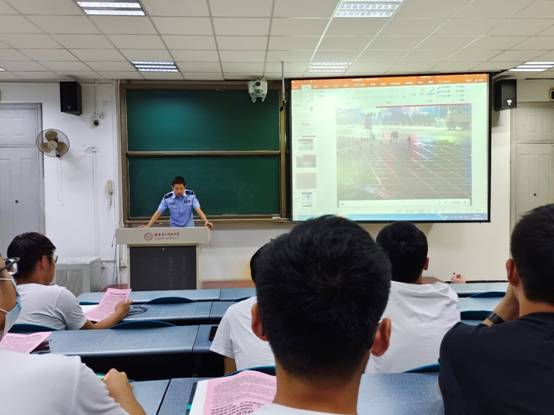 报告会伊始,蔡警官介绍了南校区自2020年七月至今的电诈案发生情况,随后借助生动的案例分别介绍了虚假购物诈骗、冒充客服诈骗、老师、领导诈骗、刷单返利诈骗、裸聊诈骗、冒充“公检法”诈骗、注销“校园贷”诈骗、虚假投资理财诈骗、“杀猪盘”诈骗、冒充港澳台交换生诈骗、宿舍推销、发展代理诈骗等十几种常见电信诈骗。随后蔡警官向同学们宣传了“三不一多”原则:即未知链接不点击,陌生来电不轻信,个人信息不透露,转账汇款多核实。最后蔡警官展示了几个校园内外的监控录像,强调了道路交通安全的重要性,借此引起同学们的重视,提高安全意识。