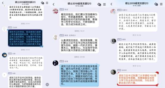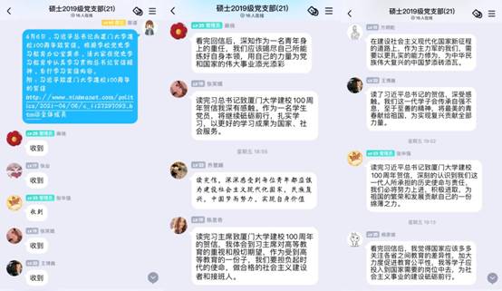 4月6日,中共中央总书记、国家主席、中央军委主席习近平致信祝贺厦门大学建校100周年,向全体师生员工和海内外员工致以热烈的祝贺和诚挚的问候。贺信在全国教育系统广大干部师生中引发热烈反响,古天乐太阳集团城硕士2019级党支部全体成员热议回信内容。