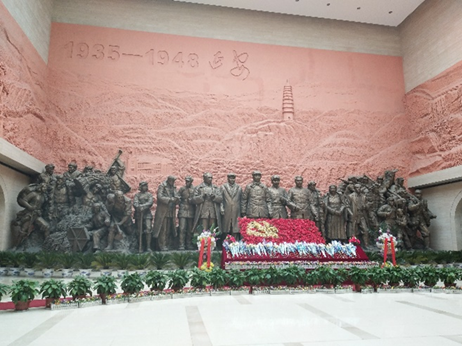 很快我们就到达了此行的第二站——延安革命纪念馆。两侧有柏树组成“延安精神、永放光芒”的八个大字,高大的毛主席雕像伫立在广场中央,展馆正门上方悬挂着红色匾牌,上面还有郭若沫先生1971年来延安参观时题写的馆名。