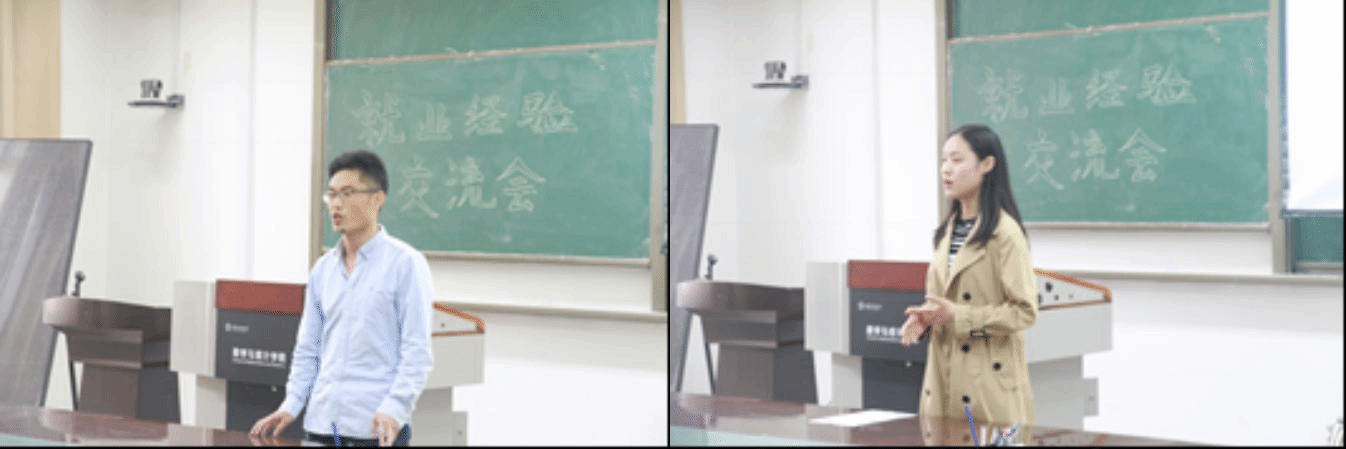 交流会开始,首先分享经验的是女生签约薪酬最高的薛小娜同学,她通过自己的经历告诉同学们找工作首先应该自身定位,并结合自身特点多方面查找信息,鼓励大家多参加竞赛,学习算法熟练编程,强调在求职期间坚持不懈,善于总结才是硬道理。接着签约华为的马久龙同学从简历制作到面试、笔试详细介绍了自己的求职过程,提醒大家要多注意面试技巧和专业知识表达能力。