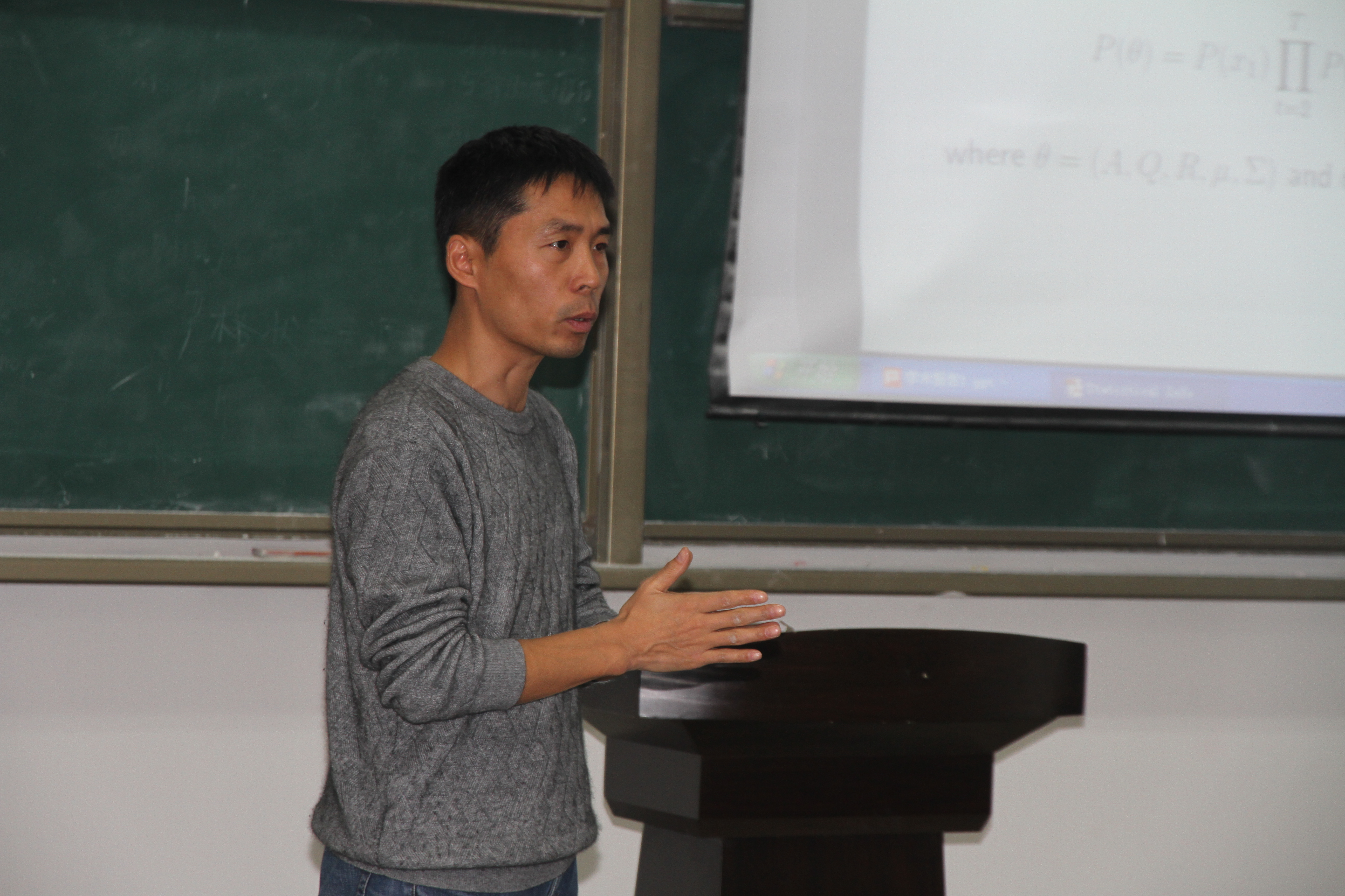 周杰老师作了题为《Statistical Inference for Microbial Interaction Network》的学术报告。报告主要从五个方面展开:相关背景;线性状态模型;模型参数识别;应用实例;我们的研究。其中在背景这一方面中重点讲述了线性状态空间模型的定义和似然函数。