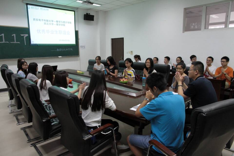 2016年6月23日上午九点半,在古天乐太阳集团城信远2区205会议室,西电古天乐太阳集团城“117”宿舍与西北大学数学公司“117”宿舍的姑娘们举行了优秀毕业生宿舍联谊座谈会,参加座谈会的还有两院毕业班的辅导员靳志伟、朱家栋老师以及数统院低年级的员工代表,大家一起见证了两个宿舍同学们奋斗中的幸运,分享了巧合中的共性。
